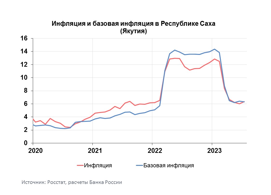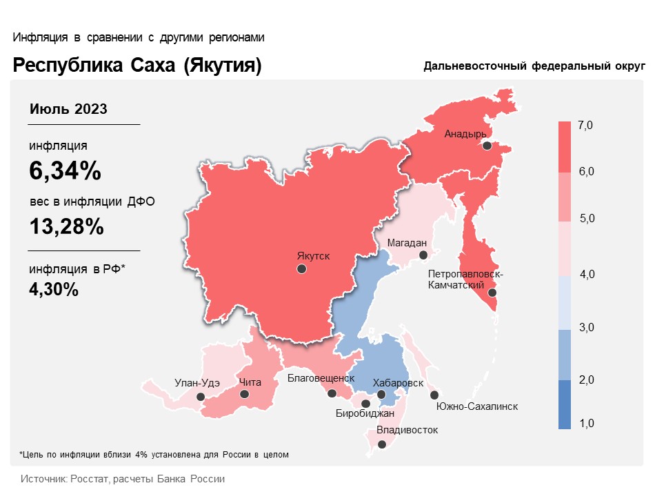 Годовая инфляция в Республике Саха (Якутия) в июле 2023 года по сравнению с июнем ускорилась на 0,33 п.п., до 6,34%. Это выше, чем в Дальневосточном федеральном округе (4,56%) и в целом по России (4,30%). Ускорение годовой инфляции в республике во многом объясняется ослаблением рубля.